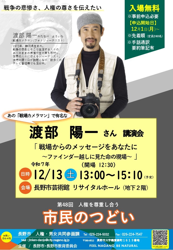 明るく住みよい長野市の実現の一助として、また、人権問題を自分のこととして共に考える機会として、「人権を尊重し合う市民のつどい」を開催します(入場無料・要事前申込)。