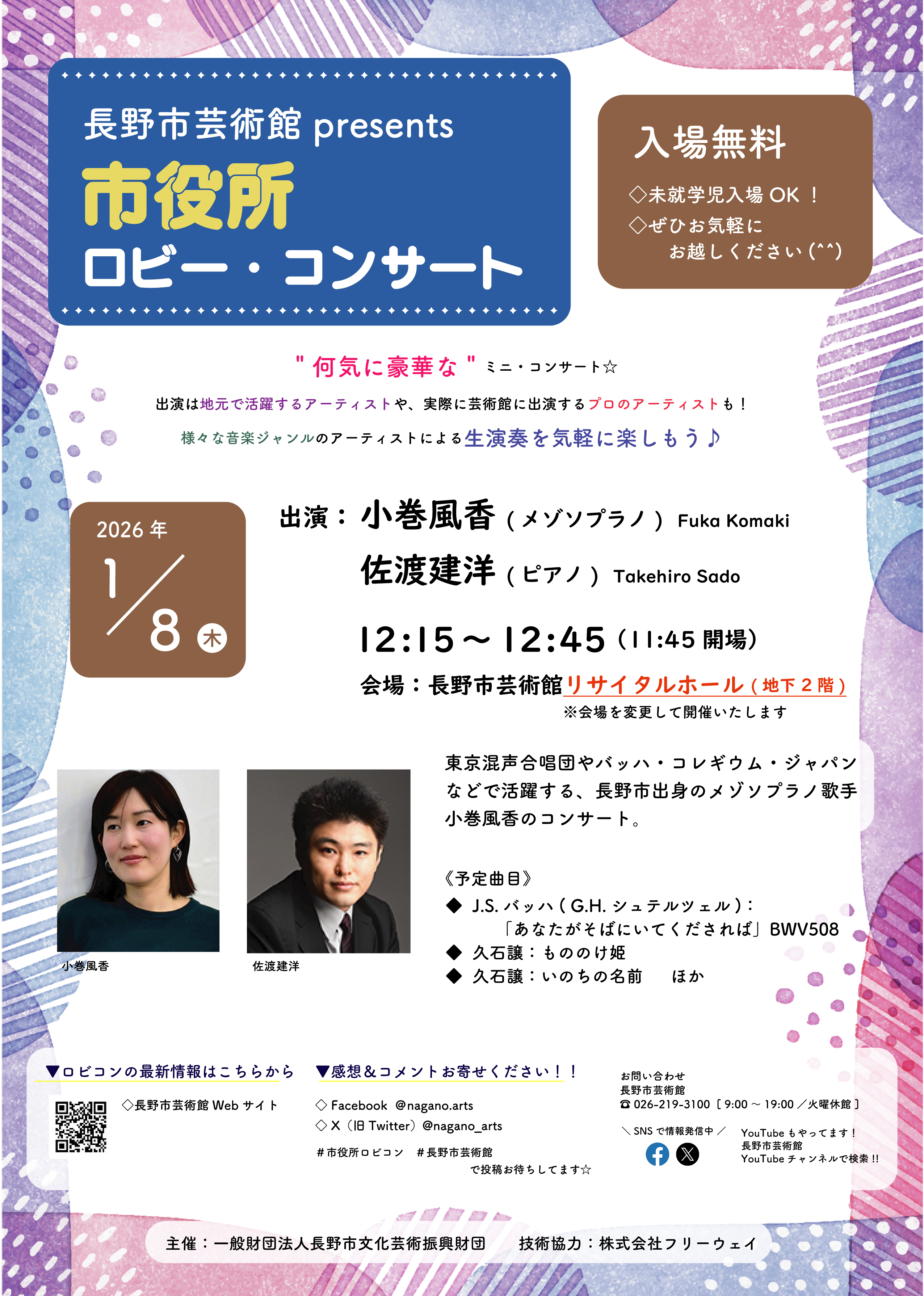 長野市芸術館主催の本日の市役所ロビー・コンサート「小巻風香(メゾソプラノ)&佐渡建洋(ピアノ)」(12:15開演)は諸事情により、メインホールホワイエではなく地下2階のリサイタルホールで開催いたします。