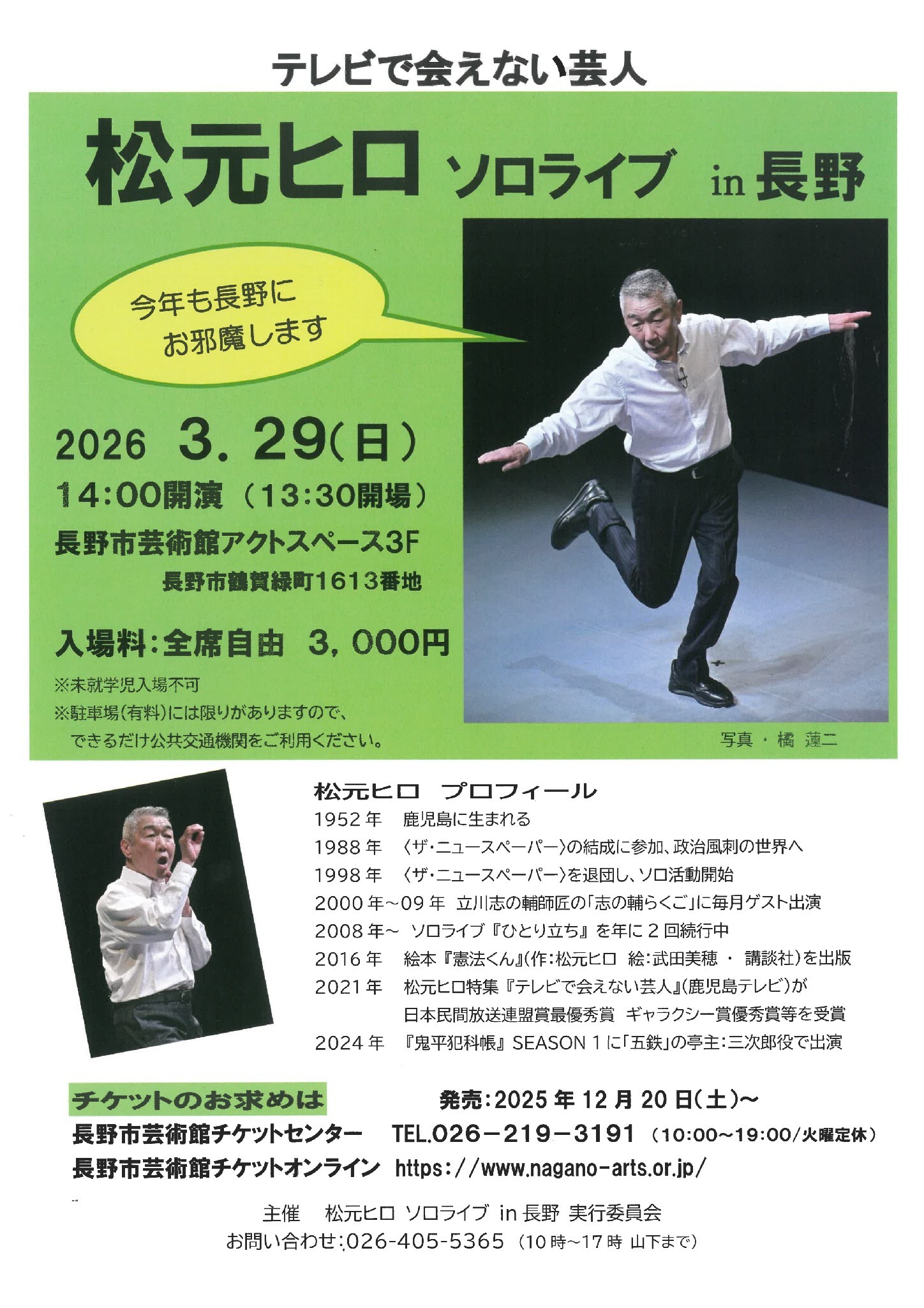 | 主催・問合せ先 | 松元ヒロ ソロライブ in 長野実行員会 tel: 026-405-5365 |